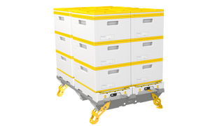 The interlocking design of the HiveIQ beehive and hive bodies ensures the integrity of a complete HiveIQ pallet (load stays secure).